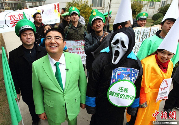 2月21日,11位来自全国各地、自称是污染企业老板的男子聚在江苏黄埔再生资源利用有限公司陈光标的公司内,在一大堆已经燃放后的烟花爆竹废品前戴上象征绿色出行的绿帽子,举起写有“不放烟花、少造点纸、支持正能量、给力垃圾分类”等牌子,用一种近乎行为艺术的方式响应陈光标日前发出的环保号召。图为陈光标(前左)与他们一起走进居民小区宣传环保。