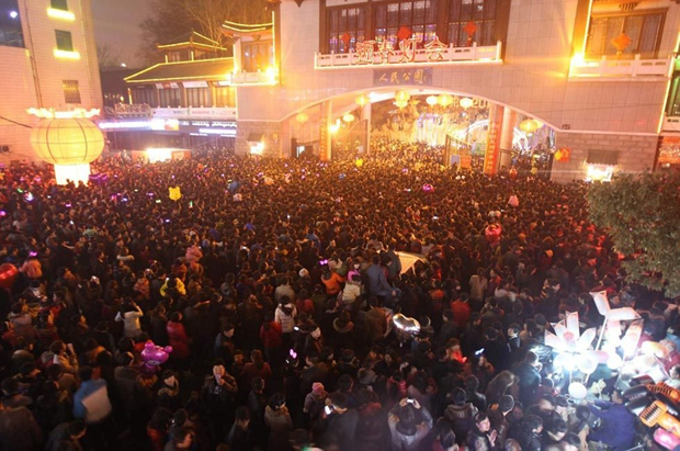 2013年2月24日,正月十五元宵节,郑州人民公园东路,等待入园观灯的人群。