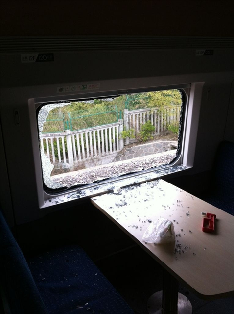 2月17日,D3012次动车,被砸开的车窗。