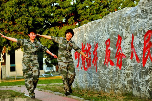 新兵连时,虽不在一个班,但积极上进的性格总能让她们在各种公差勤务中不期而遇。下连后,甚至到了第二年,她们两姐妹还和新兵连那会儿一样,什么脏活累活总是抢着干,战友说她们怎么这么“二”,跟个新兵似的,陈亚男和杜思敏相视一笑,“能为大家干点儿活,觉得自己可幸福了!”每天下午的体能训练,她俩也总是积极地站在排头,紧紧跟着前边的男兵队伍,直到班长喊着让她俩慢一点,她们才放慢了速度,心里却很是不甘。