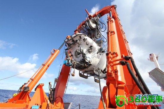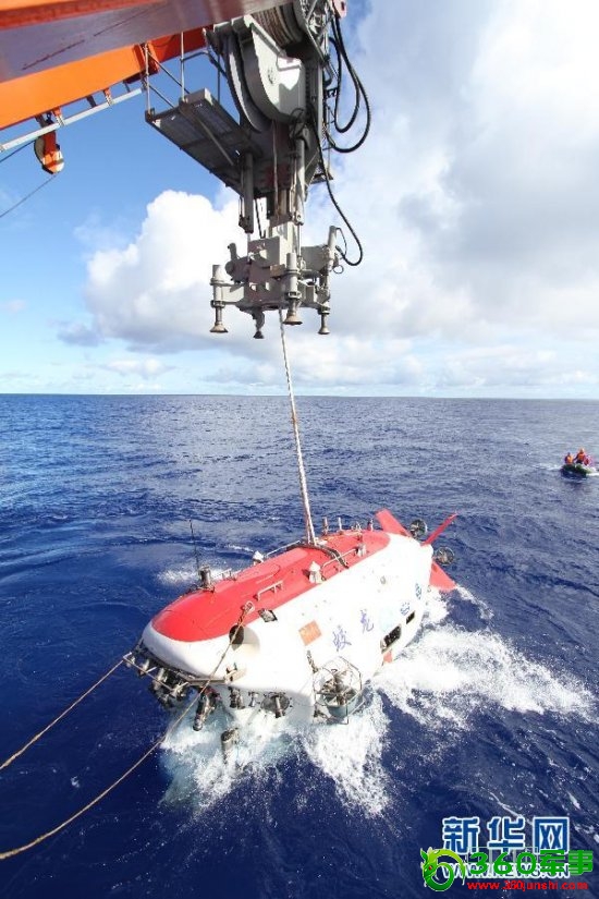 6月15日拍摄的试验中正在被放入水中的“蛟龙”号。北京时间15日7时,在西太平洋马里亚纳海沟试验区,3名试航员乘“蛟龙”号载人潜水器开始进行7000米级海试第一次下潜试验。